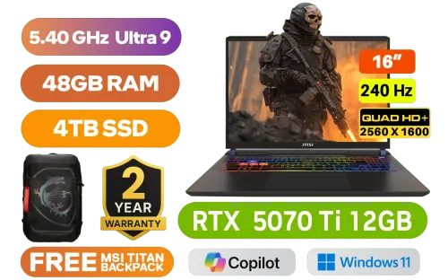MSI VECTOR 16 HX AI A2XWHG Intel® Core™ Ultra 9-275HX up to 5.40GHz Processor, 76MB Cache, 24x Cores, 24x Threads / 48GB DDR5 RAM / 4TB Ultra-Fast NVMe SSD / 16" QHD+ (2560 x 1600) Anti-Glare 240Hz IPS-Level Display / NVIDIA 50 Series GeForce RTX 5070 Ti 12GB GDDR7 Graphics With Desktop Level Performance / Windows 11 Home / Intel® Killer™ BE Wi-Fi 7 BR1750x Wireless LAN / Bluetooth 5.4 / IR FHD type (30fps@1080p) with HDR Web Camera / 2 x USB Type-A 3.2 Gen2 / 2 x USB Type-C Thunderbolt 5 (DisplayPort / Power Delivery 3.1) / 1 x HDMI (8K@ 60Hz / 4K@ 120Hz) / 1 x Headphone and Microphone Combo Jack / 1 x SD Card Reader / 1x RJ-45 Ethernet Lan / 24-Zone RGB Backlit Gaming Keyboard With Copilot Key / Virtual Surround Sound Powered by Nahimic / 2x 2W Speaker / FREE MSI Titan Gaming Backpack / 2 Year MSI Warranty / MSI VECTOR 16 HX AI A2XWHG Core Ultra 9 RTX 5070 Ti Gaming LaptopMSI VECTOR 16 HX AI A2XWHG Intel® Core™ Ultra 9-275HX up to 5.40GHz Processor, 76MB Cache, 24x Cores, 24x Threads / 48GB DDR5 RAM / 4TB Ultra-Fast NVMe SSD / 16" QHD+ (2560 x 1600) Anti-Glare 240Hz IPS-Level Display / NVIDIA 50 Series GeForce RTX 5070 Ti 12GB GDDR7 Graphics With Desktop Level Performance / Windows 11 Home / Intel® Killer™ BE Wi-Fi 7 BR1750x Wireless LAN / Bluetooth 5.4 / IR FHD type (30fps@1080p) with HDR Web Camera / 2 x USB Type-A 3.2 Gen2 / 2 x USB Type-C Thunderbolt 5 (DisplayPort / Power Delivery 3.1) / 1 x HDMI (8K@ 60Hz / 4K@ 120Hz) / 1 x Headphone and Microphone Combo Jack / 1 x SD Card Reader / 1x RJ-45 Ethernet Lan / 24-Zone RGB Backlit Gaming Keyboard With Copilot Key / Virtual Surround Sound Powered by Nahimic / 2x 2W Speaker / FREE MSI Titan Gaming Backpack / 2 Year MSI Warranty / MSI VECTOR 16 HX AI A2XWHG Core Ultra 9 RTX 5070 Ti Gaming Laptop [VECTOR-16-HX-AI-A2XWHG-230ZA/48GB/4TB] + FREE DELIVERY !
