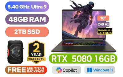MSI VECTOR 16 HX AI A2XWIG-229ZA Intel® Core™ Ultra 9-275HX up to 5.40GHz Processor, 76MB Cache, 24x Cores, 24x Threads / 48GB DDR5 RAM / 2TB Ultra-Fast NVMe SSD / 16" QHD+ (2560 x 1600) Anti-Glare 240Hz IPS-Level Display / NVIDIA 50 Series GeForce RTX 5080 16GB GDDR7 Graphics With Desktop Level Performance / Windows 11 Home / Intel® Killer™ BE Wi-Fi 7 BE1750x Wireless LAN / Bluetooth 5.4 / IR FHD type (30fps@1080p) with HDR Web Camera / 2 x USB Type-A 3.2 Gen2 / 2 x USB Type-C Thunderbolt 5 (DisplayPort / Power Delivery 3.1) / 1 x HDMI (8K@ 60Hz / 4K@ 120Hz) / 1 x Headphone and Microphone Combo Jack / 1 x SD Card Reader / 1x RJ-45 Ethernet Lan / 24-Zone RGB Backlit Gaming Keyboard With Copilot Key / Virtual Surround Sound Powered by Nahimic / 2x 2W Speaker / FREE MSI Titan Gaming Backpack / 2 Year MSI Warranty / MSI VECTOR 16 HX AI A2XWIG Core Ultra 9 RTX 5080 Gaming LaptopMSI VECTOR 16 HX AI A2XWIG-229ZA Intel® Core™ Ultra 9-275HX up to 5.40GHz Processor, 76MB Cache, 24x Cores, 24x Threads / 48GB DDR5 RAM / 2TB Ultra-Fast NVMe SSD / 16" QHD+ (2560 x 1600) Anti-Glare 240Hz IPS-Level Display / NVIDIA 50 Series GeForce RTX 5080 16GB GDDR7 Graphics With Desktop Level Performance / Windows 11 Home / Intel® Killer™ BE Wi-Fi 7 BE1750x Wireless LAN / Bluetooth 5.4 / IR FHD type (30fps@1080p) with HDR Web Camera / 2 x USB Type-A 3.2 Gen2 / 2 x USB Type-C Thunderbolt 5 (DisplayPort / Power Delivery 3.1) / 1 x HDMI (8K@ 60Hz / 4K@ 120Hz) / 1 x Headphone and Microphone Combo Jack / 1 x SD Card Reader / 1x RJ-45 Ethernet Lan / 24-Zone RGB Backlit Gaming Keyboard With Copilot Key / Virtual Surround Sound Powered by Nahimic / 2x 2W Speaker / FREE MSI Titan Gaming Backpack / 2 Year MSI Warranty / MSI VECTOR 16 HX AI A2XWIG Core Ultra 9 RTX 5080 Gaming Laptop [VECTOR-16-HX-AI A2XWIG-229ZA/48GB/2TB] / [+]Get Resident Evil Requiem with select GeForce RTX 50 Series (Standard Edition)+ FREE DELIVERY !