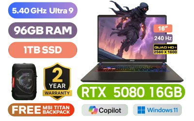 MSI VECTOR 16 HX AI A2XWIG-229ZA Intel® Core™ Ultra 9-275HX up to 5.40GHz Processor, 76MB Cache, 24x Cores, 24x Threads / 96GB DDR5 RAM / 1TB Ultra-Fast NVMe SSD / 16" QHD+ (2560 x 1600) Anti-Glare 240Hz IPS-Level Display / NVIDIA 50 Series GeForce RTX 5080 16GB GDDR7 Graphics With Desktop Level Performance / Windows 11 Home / Intel® Killer™ BE Wi-Fi 7 BE1750x Wireless LAN / Bluetooth 5.4 / IR FHD type (30fps@1080p) with HDR Web Camera / 2 x USB Type-A 3.2 Gen2 / 2 x USB Type-C Thunderbolt 5 (DisplayPort / Power Delivery 3.1) / 1 x HDMI (8K@ 60Hz / 4K@ 120Hz) / 1 x Headphone and Microphone Combo Jack / 1 x SD Card Reader / 1x RJ-45 Ethernet Lan / 24-Zone RGB Backlit Gaming Keyboard With Copilot Key / Virtual Surround Sound Powered by Nahimic / 2x 2W Speaker / FREE MSI Titan Gaming Backpack / 2 Year MSI Warranty / MSI VECTOR 16 HX AI A2XWIG Core Ultra 9 RTX 5080 Gaming LaptopMSI VECTOR 16 HX AI A2XWIG-229ZA Intel® Core™ Ultra 9-275HX up to 5.40GHz Processor, 76MB Cache, 24x Cores, 24x Threads / 96GB DDR5 RAM / 1TB Ultra-Fast NVMe SSD / 16" QHD+ (2560 x 1600) Anti-Glare 240Hz IPS-Level Display / NVIDIA 50 Series GeForce RTX 5080 16GB GDDR7 Graphics With Desktop Level Performance / Windows 11 Home / Intel® Killer™ BE Wi-Fi 7 BE1750x Wireless LAN / Bluetooth 5.4 / IR FHD type (30fps@1080p) with HDR Web Camera / 2 x USB Type-A 3.2 Gen2 / 2 x USB Type-C Thunderbolt 5 (DisplayPort / Power Delivery 3.1) / 1 x HDMI (8K@ 60Hz / 4K@ 120Hz) / 1 x Headphone and Microphone Combo Jack / 1 x SD Card Reader / 1x RJ-45 Ethernet Lan / 24-Zone RGB Backlit Gaming Keyboard With Copilot Key / Virtual Surround Sound Powered by Nahimic / 2x 2W Speaker / FREE MSI Titan Gaming Backpack / 2 Year MSI Warranty / MSI VECTOR 16 HX AI A2XWIG Core Ultra 9 RTX 5080 Gaming Laptop [VECTOR-16-HX-AI A2XWIG-229ZA/96GB] / [+]Get Resident Evil Requiem with select GeForce RTX 50 Series (Standard Edition)+ FREE DELIVERY !