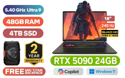 MSI Vector 16 Intel® Core™ Ultra 9 275HX up to 5.40GHz Processor, 76MB Cache, 24x Cores, 24x Threads / 48GB DDR5 RAM / 4TB Ultra-Fast NVMe SSD / 16" QHD+ (2560x1600) 240Hz IPS-Level Display / NVIDIA 50 Series GeForce RTX 5090 24GB GDDR7 Graphics / Windows 11 Home (64bit) / Intel® Killer™ BE1750x Wi-Fi 7 Wireless LAN / Bluetooth 5.4 / FHD 1080p IR Web Camera / 24-Zone RGB Gaming Keyboard / 2 x USB Type-A / 2 x USB Type-C Thunderbolt™ 5 (DisplayPort™/ Power Delivery 3.1) / 1 x HDMI 2.1 / 1x RJ45 / 1 x SD Express Card Reader / 1 x Headphone and Microphone Combo Jack / Nahimic by Steelseries Audio / 2x 2W Speaker / 2 Year MSI Warranty / Free MSI Titan Gaming Backpack / MSI Vector 16 Intel® Core™ Ultra 9 275HX RTX 5090 Gaming Laptop DealMSI Vector 16 Intel® Core™ Ultra 9 275HX up to 5.40GHz Processor, 76MB Cache, 24x Cores, 24x Threads / 48GB DDR5 RAM / 4TB Ultra-Fast NVMe SSD / 16" QHD+ (2560x1600) 240Hz IPS-Level Display / NVIDIA 50 Series GeForce RTX 5090 24GB GDDR7 Graphics / Windows 11 Home (64bit) / Intel® Killer™ BE1750x Wi-Fi 7 Wireless LAN / Bluetooth 5.4 / FHD 1080p IR Web Camera / 24-Zone RGB Gaming Keyboard / 2 x USB Type-A / 2 x USB Type-C Thunderbolt™ 5 (DisplayPort™/ Power Delivery 3.1) / 1 x HDMI 2.1 / 1x RJ45 / 1 x SD Express Card Reader / 1 x Headphone and Microphone Combo Jack / Nahimic by Steelseries Audio / 2x 2W Speaker / 2 Year MSI Warranty / Free MSI Titan Gaming Backpack / MSI Vector 16 Intel® Core™ Ultra 9 275HX RTX 5090 Gaming Laptop Deal [MSI-Vector-16-HX-AI-A2XWJG-482ZA/48GB/4TB] + FREE DELIVERY !