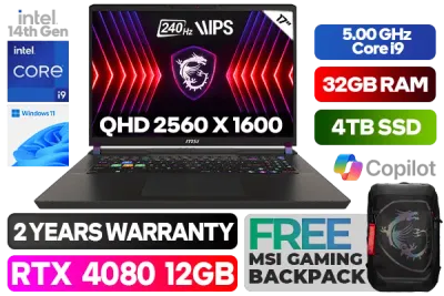 MSI VECTOR 17 HX A14VHG 14th Gen Core i9-14900HX up to 5.80GHz Processor, 24MB Cache, 24x Cores, 32x Threads / 32GB DDR5 RAM / 4TB Ultra-Fast NVMe SSD / 17" QHD (2560 x 1600) Anti-Glare 240Hz Refresh-rate With IPS-Level Display / NVIDIA 40 Series GeForce RTX 4080 12GB GDDR6 Graphics With Desktop Level Performance / Windows 11 Home (64bit) / Bluetooth 5.4 / Intel® Killer™ BE Wi-Fi 7 Wireless LAN / Killer Gb LAN / HD type (30fps@720p) Web Camera / Steelseries Per Key RGB Backlit Gaming Keyboard / 2 x Type-A USB 3.2 Gen1 / 3 x Type-C USB 3.2 Gen2 / 1 x HDMI (4K @ 120Hz) / 1 x Headphone and Microphone Combo Jack / Virtual Surround Sound Powered by Nahimic / 2x 2W Speaker / Advance Cooler Boosts 5 Cooling System / 2 Year MSI Warranty / FREE MSI Gaming Backpack / MSI VECTOR 17 HX A14VHG 14th Gen Core i9 RTX 4080 Gaming LaptopMSI VECTOR 17 HX A14VHG 14th Gen Core i9-14900HX up to 5.80GHz Processor, 24MB Cache, 24x Cores, 32x Threads / 32GB DDR5 RAM / 4TB Ultra-Fast NVMe SSD / 17" QHD (2560 x 1600) Anti-Glare 240Hz Refresh-rate With IPS-Level Display / NVIDIA 40 Series GeForce RTX 4080 12GB GDDR6 Graphics With Desktop Level Performance / Windows 11 Home (64bit) / Bluetooth 5.4 / Intel® Killer™ BE Wi-Fi 7 Wireless LAN / Killer Gb LAN / HD type (30fps@720p) Web Camera / Steelseries Per Key RGB Backlit Gaming Keyboard / 2 x Type-A USB 3.2 Gen1 / 3 x Type-C USB 3.2 Gen2 / 1 x HDMI (4K @ 120Hz) / 1 x Headphone and Microphone Combo Jack / Virtual Surround Sound Powered by Nahimic / 2x 2W Speaker / Advance Cooler Boosts 5 Cooling System / 2 Year MSI Warranty / FREE MSI Gaming Backpack / MSI VECTOR 17 HX A14VHG 14th Gen Core i9 RTX 4080 Gaming Laptop [VECTOR-17-HX-A14VHG-829ZA/4TB] + FREE DELIVERY !