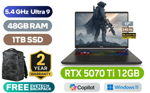 MSI Vector 17 HX AI A2XWHG Intel Core Ultra 9-275HX up to 5.4GHz Processor, 76MB Cache, 24x Cores, 24x Threads / 48GB DDR5 RAM / 1TB Ultra-Fast NVMe SSD / 17” QHD+ (2560x1600) 240Hz Anti-Glare IPS-Level Display / NVIDIA 50 Series GeForce RTX 5070 Ti 12GB GDDR7 Graphics Card / Windows 11 Home / Intel® Killer™ BE Wi-Fi 7 BE1750x Wireless LAN / Bluetooth 5.4 / 1080p FHD IR Camera with Privacy Shutter / 1x USB Type-A / 2x USB Type-C (Supports Thunderbolt™ 5 / DisplayPort™/ Power Delivery 3.1) / 1x HDMI / 1x SD Card Reader / 1x Headphone & Microphone Combo Jack / RGB Backlit Keyboard / 2x 2W Speaker System / MSI Vector 17 HX AI A2XWHG Core Ultra 9 RTX 5070 Ti LaptopMSI Vector 17 HX AI A2XWHG Intel Core Ultra 9-275HX up to 5.4GHz Processor, 76MB Cache, 24x Cores, 24x Threads / 48GB DDR5 RAM / 1TB Ultra-Fast NVMe SSD / 17” QHD+ (2560x1600) 240Hz Anti-Glare IPS-Level Display / NVIDIA 50 Series GeForce RTX 5070 Ti 12GB GDDR7 Graphics Card / Windows 11 Home / Intel® Killer™ BE Wi-Fi 7 BE1750x Wireless LAN / Bluetooth 5.4 / 1080p FHD IR Camera with Privacy Shutter / 1x USB Type-A / 2x USB Type-C (Supports Thunderbolt™ 5 / DisplayPort™/ Power Delivery 3.1) / 1x HDMI / 1x SD Card Reader / 1x Headphone & Microphone Combo Jack / RGB Backlit Keyboard / 2x 2W Speaker System / MSI Vector 17 HX AI A2XWHG Core Ultra 9 RTX 5070 Ti Laptop [Vector-17-HX-AI A2XWHG-226ZA/48GB] / [+] GET FREE EVETECH DASH Premium Gaming Backpack / [+]Get Resident Evil: Requiem with select GeForce RTX 50 Series (Standard Edition)+ FREE DELIVERY !