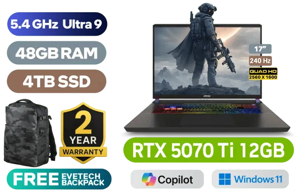 MSI Vector 17 HX AI A2XWHG Intel Core Ultra 9-275HX up to 5.4GHz Processor, 76MB Cache, 24x Cores, 24x Threads / 48GB DDR5 RAM / 4TB Ultra-Fast NVMe SSD / 17” QHD+ (2560x1600) 240Hz Anti-Glare IPS-Level Display / NVIDIA 50 Series GeForce RTX 5070 Ti 12GB GDDR7 Graphics Card / Windows 11 Home / Intel® Killer™ BE Wi-Fi 7 BE1750x Wireless LAN / Bluetooth 5.4 / 1080p FHD IR Camera with Privacy Shutter / 1x USB Type-A / 2x USB Type-C (Supports Thunderbolt™ 5 / DisplayPort™/ Power Delivery 3.1) / 1x HDMI / 1x SD Card Reader / 1x Headphone & Microphone Combo Jack / RGB Backlit Keyboard / 2x 2W Speaker System / MSI Vector 17 HX AI A2XWHG Core Ultra 9 RTX 5070 Ti LaptopMSI Vector 17 HX AI A2XWHG Intel Core Ultra 9-275HX up to 5.4GHz Processor, 76MB Cache, 24x Cores, 24x Threads / 48GB DDR5 RAM / 4TB Ultra-Fast NVMe SSD / 17” QHD+ (2560x1600) 240Hz Anti-Glare IPS-Level Display / NVIDIA 50 Series GeForce RTX 5070 Ti 12GB GDDR7 Graphics Card / Windows 11 Home / Intel® Killer™ BE Wi-Fi 7 BE1750x Wireless LAN / Bluetooth 5.4 / 1080p FHD IR Camera with Privacy Shutter / 1x USB Type-A / 2x USB Type-C (Supports Thunderbolt™ 5 / DisplayPort™/ Power Delivery 3.1) / 1x HDMI / 1x SD Card Reader / 1x Headphone & Microphone Combo Jack / RGB Backlit Keyboard / 2x 2W Speaker System / MSI Vector 17 HX AI A2XWHG Core Ultra 9 RTX 5070 Ti Laptop [Vector-17-HX-AI A2XWHG-226ZA/48GB/4TB] / [+]Get Resident Evil Requiem with select GeForce RTX 50 Series (Standard Edition)+ FREE DELIVERY !