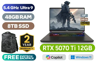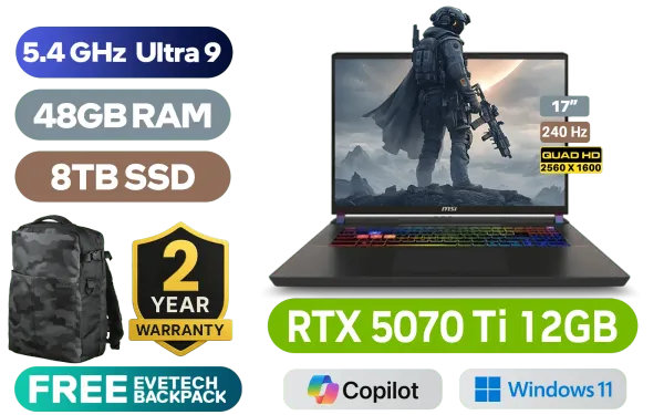 MSI Vector 17 HX AI A2XWHG Intel Core Ultra 9-275HX up to 5.4GHz Processor, 76MB Cache, 24x Cores, 24x Threads / 48GB DDR5 RAM / 8TB Ultra-Fast NVMe SSD / 17” QHD+ (2560x1600) 240Hz Anti-Glare IPS-Level Display / NVIDIA 50 Series GeForce RTX 5070 Ti 12GB GDDR7 Graphics Card / Windows 11 Home / Intel® Killer™ BE Wi-Fi 7 BE1750x Wireless LAN / Bluetooth 5.4 / 1080p FHD IR Camera with Privacy Shutter / 1x USB Type-A / 2x USB Type-C (Supports Thunderbolt™ 5 / DisplayPort™/ Power Delivery 3.1) / 1x HDMI / 1x SD Card Reader / 1x Headphone & Microphone Combo Jack / RGB Backlit Keyboard / 2x 2W Speaker System / MSI Vector 17 HX AI A2XWHG Core Ultra 9 RTX 5070 Ti LaptopMSI Vector 17 HX AI A2XWHG Intel Core Ultra 9-275HX up to 5.4GHz Processor, 76MB Cache, 24x Cores, 24x Threads / 48GB DDR5 RAM / 8TB Ultra-Fast NVMe SSD / 17” QHD+ (2560x1600) 240Hz Anti-Glare IPS-Level Display / NVIDIA 50 Series GeForce RTX 5070 Ti 12GB GDDR7 Graphics Card / Windows 11 Home / Intel® Killer™ BE Wi-Fi 7 BE1750x Wireless LAN / Bluetooth 5.4 / 1080p FHD IR Camera with Privacy Shutter / 1x USB Type-A / 2x USB Type-C (Supports Thunderbolt™ 5 / DisplayPort™/ Power Delivery 3.1) / 1x HDMI / 1x SD Card Reader / 1x Headphone & Microphone Combo Jack / RGB Backlit Keyboard / 2x 2W Speaker System / MSI Vector 17 HX AI A2XWHG Core Ultra 9 RTX 5070 Ti Laptop [Vector-17-HX-AI A2XWHG-226ZA/48GB/8TB] / [+]Get Resident Evil Requiem with select GeForce RTX 50 Series (Standard Edition)+ FREE DELIVERY !
