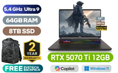 MSI Vector 17 HX AI A2XWHG Intel Core Ultra 9-275HX up to 5.4GHz Processor, 76MB Cache, 24x Cores, 24x Threads / 64GB DDR5 RAM / 8TB Ultra-Fast NVMe SSD / 17” QHD+ (2560x1600) 240Hz Anti-Glare IPS-Level Display / NVIDIA 50 Series GeForce RTX 5070 Ti 12GB GDDR7 Graphics Card / Windows 11 Home / Intel® Killer™ BE Wi-Fi 7 BE1750x Wireless LAN / Bluetooth 5.4 / 1080p FHD IR Camera with Privacy Shutter / 1x USB Type-A / 2x USB Type-C (Supports Thunderbolt™ 5 / DisplayPort™/ Power Delivery 3.1) / 1x HDMI / 1x SD Card Reader / 1x Headphone & Microphone Combo Jack / RGB Backlit Keyboard / 2x 2W Speaker System / MSI Vector 17 HX AI A2XWHG Core Ultra 9 RTX 5070 Ti LaptopMSI Vector 17 HX AI A2XWHG Intel Core Ultra 9-275HX up to 5.4GHz Processor, 76MB Cache, 24x Cores, 24x Threads / 64GB DDR5 RAM / 8TB Ultra-Fast NVMe SSD / 17” QHD+ (2560x1600) 240Hz Anti-Glare IPS-Level Display / NVIDIA 50 Series GeForce RTX 5070 Ti 12GB GDDR7 Graphics Card / Windows 11 Home / Intel® Killer™ BE Wi-Fi 7 BE1750x Wireless LAN / Bluetooth 5.4 / 1080p FHD IR Camera with Privacy Shutter / 1x USB Type-A / 2x USB Type-C (Supports Thunderbolt™ 5 / DisplayPort™/ Power Delivery 3.1) / 1x HDMI / 1x SD Card Reader / 1x Headphone & Microphone Combo Jack / RGB Backlit Keyboard / 2x 2W Speaker System / MSI Vector 17 HX AI A2XWHG Core Ultra 9 RTX 5070 Ti Laptop [Vector-17-HX-AI A2XWHG-226ZA/64GB/8TB] / [+]Get Resident Evil Requiem with select GeForce RTX 50 Series (Standard Edition)+ FREE DELIVERY !