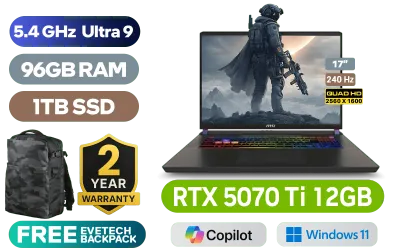MSI Vector 17 HX AI A2XWHG Intel Core Ultra 9-275HX up to 5.4GHz Processor, 76MB Cache, 24x Cores, 24x Threads / 96GB DDR5 RAM / 1TB Ultra-Fast NVMe SSD / 17” QHD+ (2560x1600) 240Hz Anti-Glare IPS-Level Display / NVIDIA 50 Series GeForce RTX 5070 Ti 12GB GDDR7 Graphics Card / Windows 11 Home / Intel® Killer™ BE Wi-Fi 7 BE1750x Wireless LAN / Bluetooth 5.4 / 1080p FHD IR Camera with Privacy Shutter / 1x USB Type-A / 2x USB Type-C (Supports Thunderbolt™ 5 / DisplayPort™/ Power Delivery 3.1) / 1x HDMI / 1x SD Card Reader / 1x Headphone & Microphone Combo Jack / RGB Backlit Keyboard / 2x 2W Speaker System / MSI Vector 17 HX AI A2XWHG Core Ultra 9 RTX 5070 Ti LaptopMSI Vector 17 HX AI A2XWHG Intel Core Ultra 9-275HX up to 5.4GHz Processor, 76MB Cache, 24x Cores, 24x Threads / 96GB DDR5 RAM / 1TB Ultra-Fast NVMe SSD / 17” QHD+ (2560x1600) 240Hz Anti-Glare IPS-Level Display / NVIDIA 50 Series GeForce RTX 5070 Ti 12GB GDDR7 Graphics Card / Windows 11 Home / Intel® Killer™ BE Wi-Fi 7 BE1750x Wireless LAN / Bluetooth 5.4 / 1080p FHD IR Camera with Privacy Shutter / 1x USB Type-A / 2x USB Type-C (Supports Thunderbolt™ 5 / DisplayPort™/ Power Delivery 3.1) / 1x HDMI / 1x SD Card Reader / 1x Headphone & Microphone Combo Jack / RGB Backlit Keyboard / 2x 2W Speaker System / MSI Vector 17 HX AI A2XWHG Core Ultra 9 RTX 5070 Ti Laptop [Vector-17-HX-AI A2XWHG-226ZA/96GB] / [+]Get Resident Evil Requiem with select GeForce RTX 50 Series (Standard Edition)+ FREE DELIVERY !