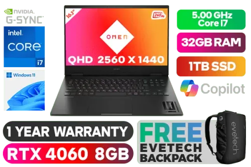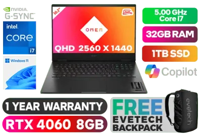 OMEN by HP Gaming Laptop 16-wf0003ni 13th Gen Intel® Core™ i7-13700HX up to 5.00GHz Processor, 30MB Cache, 16x Cores, 24x Threads / 32GB DDR5 RAM / 1TB Ultra-Fast NVME SSD / 16.1" QHD 2560 x 1440 Anti-glare 240Hz Refresh Rate With IPS-Level micro-edge G-Sync Display / NVIDIA GeForce RTX 4060 8GB GDDR6 Dedicated Graphics / Windows 11 Home (64bit) / Wi-Fi 6E Wireless LAN / Bluetooth 5.3 / HP True Vision 1080p FHD camera with temporal noise reduction and integrated dual array digital microphones / 2x USB Type-A / 2x USB Type-C with Thunderbolt 4 / 1x HDMI 2.1 / 1x Headphone and Microphone Combo Jack / Integrated GbE LAN / No DVD Drive Included / RGB Backlit Keyboard / Audio by Bang & Olufsen; DTS:X® Ultra; Dual speakers; HP Audio Boost / 1 Year Warranty / OMEN by HP 16 Intel® Core™ i7 RTX 4060 Gaming Laptop 7Z8U3EA DealOMEN by HP Gaming Laptop 16-wf0003ni 13th Gen Intel® Core™ i7-13700HX up to 5.00GHz Processor, 30MB Cache, 16x Cores, 24x Threads / 32GB DDR5 RAM / 1TB Ultra-Fast NVME SSD / 16.1" QHD 2560 x 1440 Anti-glare 240Hz Refresh Rate With IPS-Level micro-edge G-Sync Display / NVIDIA GeForce RTX 4060 8GB GDDR6 Dedicated Graphics / Windows 11 Home (64bit) / Wi-Fi 6E Wireless LAN / Bluetooth 5.3 / HP True Vision 1080p FHD camera with temporal noise reduction and integrated dual array digital microphones / 2x USB Type-A / 2x USB Type-C with Thunderbolt 4 / 1x HDMI 2.1 / 1x Headphone and Microphone Combo Jack / Integrated GbE LAN / No DVD Drive Included / RGB Backlit Keyboard / Audio by Bang & Olufsen; DTS:X® Ultra; Dual speakers; HP Audio Boost / 1 Year Warranty / OMEN by HP 16 Intel® Core™ i7 RTX 4060 Gaming Laptop 7Z8U3EA Deal [7Z8U3EA/32GB] / [+] GET FREE EVETECH NEO Premium Gaming Backpack+ FREE DELIVERY !