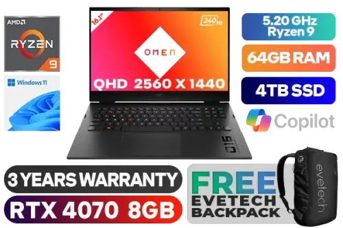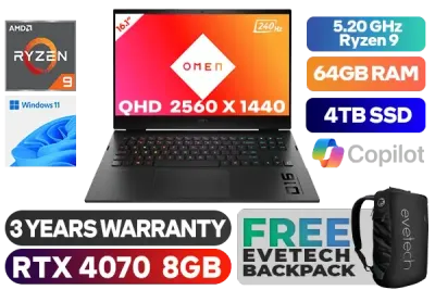 OMEN by HP Gaming Laptop 16-xf0000ni AMD Ryzen 9-7940HS up to 5.20GHz Processor, 16MB Cache, 8x Cores, 16x Threads / 64GB DDR5 RAM / 4TB Ultra-Fast NVME SSD / 16.1" QHD 2560 x 1440 Anti-glare 240Hz Refresh Rate With IPS-Level micro-edge Display / NVIDIA GeForce RTX 4070 8GB GDDR6 Dedicated Graphics / Windows 11 Home (64bit) / Wi-Fi 6E Wireless LAN / Bluetooth 5.3 / HP True Vision 1080p FHD camera with temporal noise reduction and integrated dual array digital microphones / 2x USB Type-A / 2x USB Type-C / 1x HDMI 2.1 / 1x Headphone and Microphone Combo Jack / 1x RJ-45 / RGB Backlit Keyboard / Audio by Bang & Olufsen / OMEN by HP 16 Ryzen 9 RTX 4070 Gaming Laptop DealOMEN by HP Gaming Laptop 16-xf0000ni AMD Ryzen 9-7940HS up to 5.20GHz Processor, 16MB Cache, 8x Cores, 16x Threads / 64GB DDR5 RAM / 4TB Ultra-Fast NVME SSD / 16.1" QHD 2560 x 1440 Anti-glare 240Hz Refresh Rate With IPS-Level micro-edge Display / NVIDIA GeForce RTX 4070 8GB GDDR6 Dedicated Graphics / Windows 11 Home (64bit) / Wi-Fi 6E Wireless LAN / Bluetooth 5.3 / HP True Vision 1080p FHD camera with temporal noise reduction and integrated dual array digital microphones / 2x USB Type-A / 2x USB Type-C / 1x HDMI 2.1 / 1x Headphone and Microphone Combo Jack / 1x RJ-45 / RGB Backlit Keyboard / Audio by Bang & Olufsen / OMEN by HP 16 Ryzen 9 RTX 4070 Gaming Laptop Deal [81L13EA/64GB/4TB] / 3 YEARS WARRANTY / [+] GET FREE EVETECH NEO Premium Gaming Backpack+ FREE DELIVERY !