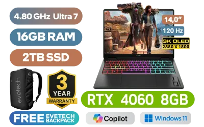 OMEN Transcend by HP 14 Gaming Laptop Intel® Core™ Ultra 7-155H up to 4.80GHz Processor, 24MB Cache, 16x Cores, 22x Threads / 16GB LPDDR5X RAM / 2TB Ultra-Fast NVME SSD / 14.0" 3K (2880 x 1800) 120Hz Refresh Rate With OLED Display / NVIDIA GeForce RTX 4060 8GB GDDR6 Dedicated Graphics / Windows 11 Home (64bit) / HP True Vision 1080p FHD camera with temporal noise reduction and integrated dual array digital microphones / Intel Wi-Fi 6E AX211 Wireless LAN / Bluetooth 5.3 / 2x USB Type-A / 2x USB Type-C / 1x HDMI 2.1 / 1x Headphone and Microphone Combo Jack / RGB Backlit Keyboard / Audio by HyperX; DTS:X® Ultra; Dual speakers; HP Audio Boost / OMEN Transcend by HP 14 Intel® Core™ Ultra 7 RTX 4060 Gaming Laptop DealOMEN Transcend by HP 14 Gaming Laptop Intel® Core™ Ultra 7-155H up to 4.80GHz Processor, 24MB Cache, 16x Cores, 22x Threads / 16GB LPDDR5X RAM / 2TB Ultra-Fast NVME SSD / 14.0" 3K (2880 x 1800) 120Hz Refresh Rate With OLED Display / NVIDIA GeForce RTX 4060 8GB GDDR6 Dedicated Graphics / Windows 11 Home (64bit) / HP True Vision 1080p FHD camera with temporal noise reduction and integrated dual array digital microphones / Intel Wi-Fi 6E AX211 Wireless LAN / Bluetooth 5.3 / 2x USB Type-A / 2x USB Type-C / 1x HDMI 2.1 / 1x Headphone and Microphone Combo Jack / RGB Backlit Keyboard / Audio by HyperX; DTS:X® Ultra; Dual speakers; HP Audio Boost / OMEN Transcend by HP 14 Intel® Core™ Ultra 7 RTX 4060 Gaming Laptop Deal [A19LDEA/2TB] / 3 YEARS WARRANTY / [+] GET FREE EVETECH NEO Premium Gaming Backpack+ FREE DELIVERY !