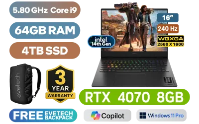 OMEN Transcend by HP Gaming Laptop 16-u1003ni Intel® Core™ i9-14900HX up to 5.80GHz Processor, 36MB Cache, 24x Cores, 32x Threads / 64GB DDR5 RAM / 4TB Ultra-Fast NVME SSD / 16" WQXGA OLED (2560 x 1600) 240Hz Refresh Rate With micro-edge Display / NVIDIA GeForce RTX 4070 8GB GDDR6 Dedicated Graphics / <span style="font-size: 20px; color: #00BFFF; font-weight: bold;">Windows 11 Professional (64bit)</span> / Intel Wi-Fi 7 BE200 Wireless LAN / Bluetooth 5.4 / 2x USB Type-A / 2x USB Type-C with Thunderbolt 4 / 1x HDMI 2.1 / 1x Headphone and Microphone Combo Jack / 1x RJ-45 / HP True Vision 1080p FHD IR Camera / RGB Backlit Keyboard / Audio by HyperX; DTS:X® Ultra; Dual speakers; HP Audio Boost / OMEN Transcend by HP 16 Intel Core i9 RTX 4070 Laptop DealOMEN Transcend by HP Gaming Laptop 16-u1003ni Intel® Core™ i9-14900HX up to 5.80GHz Processor, 36MB Cache, 24x Cores, 32x Threads / 64GB DDR5 RAM / 4TB Ultra-Fast NVME SSD / 16" WQXGA OLED (2560 x 1600) 240Hz Refresh Rate With micro-edge Display / NVIDIA GeForce RTX 4070 8GB GDDR6 Dedicated Graphics / Windows 11 Professional (64bit) / Intel Wi-Fi 7 BE200 Wireless LAN / Bluetooth 5.4 / 2x USB Type-A / 2x USB Type-C with Thunderbolt 4 / 1x HDMI 2.1 / 1x Headphone and Microphone Combo Jack / 1x RJ-45 / HP True Vision 1080p FHD IR Camera / RGB Backlit Keyboard / Audio by HyperX; DTS:X® Ultra; Dual speakers; HP Audio Boost / OMEN Transcend by HP 16 Intel Core i9 RTX 4070 Laptop Deal [A76U7EA/64GB/4TB] / [+] GET FREE EVETECH NEO Premium Gaming Backpack / 3 YEARS WARRANTY + FREE DELIVERY !