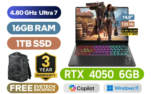 OMEN Transcend by HP Gaming Laptop 14-fb0003ni Intel® Core™ Ultra 7-155H up to 4.80GHz Processor, 24MB Cache, 16x Cores, 22x Threads / 16GB LPDDR5X RAM / 1TB Ultra-Fast NVME SSD / 14.0" 2.8K OLED 2880 x 1800 Anti-glare 120Hz Refresh Rate With micro-edge Display / NVIDIA GeForce RTX 4050 6GB GDDR6 Dedicated Graphics / Windows 11 Home (64bit) / Wi-Fi 6E Wireless LAN / Bluetooth 5.3 / 2x USB Type-A / 2x USB Type-C with Thunderbolt 4 / 1x HDMI 2.1 / 1x Headphone and Microphone Combo Jack / HP True Vision 1080p FHD IR Camera / RGB Backlit Keyboard / Audio by HyperX; DTS:X® Ultra; Dual speakers; HP Audio Boost / OMEN Transcend by HP 14 Intel® Core™ Ultra 7 RTX 4050 Gaming Laptop DealOMEN Transcend by HP Gaming Laptop 14-fb0003ni Intel® Core™ Ultra 7-155H up to 4.80GHz Processor, 24MB Cache, 16x Cores, 22x Threads / 16GB LPDDR5X RAM / 1TB Ultra-Fast NVME SSD / 14.0" 2.8K OLED 2880 x 1800 Anti-glare 120Hz Refresh Rate With micro-edge Display / NVIDIA GeForce RTX 4050 6GB GDDR6 Dedicated Graphics / Windows 11 Home (64bit) / Wi-Fi 6E Wireless LAN / Bluetooth 5.3 / 2x USB Type-A / 2x USB Type-C with Thunderbolt 4 / 1x HDMI 2.1 / 1x Headphone and Microphone Combo Jack / HP True Vision 1080p FHD IR Camera / RGB Backlit Keyboard / Audio by HyperX; DTS:X® Ultra; Dual speakers; HP Audio Boost / OMEN Transcend by HP 14 Intel® Core™ Ultra 7 RTX 4050 Gaming Laptop Deal [A19LFEA] / 3 YEARS WARRANTY / [+] GET FREE EVETECH DASH Premium Gaming Backpack+ FREE DELIVERY !
