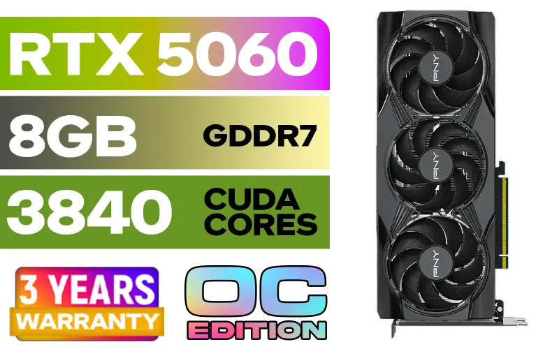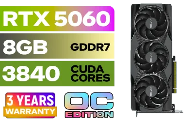 PNY GeForce RTX 5060 EPIC-X 8GB OC Graphics Card / 8GB GDDR7 / 3840 Cuda Cores / 128-bit Memory Interface / Boost Clock: 2580 MHz / 28 Gbps Memory Speed / DisplayPort 2.1b (x3), HDMI® 2.1b / PCI-Express 5.0 x8 / 9VCG50608TFXXPB1-O