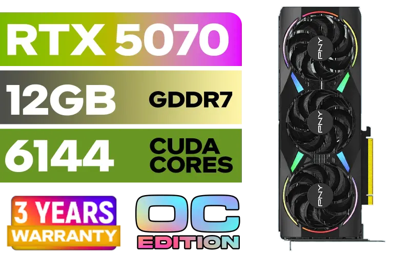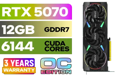 PNY GeForce RTX 5070 EPIC-X 12GB OC Graphics Card / 12GB GDDR7 / 6144 Cuda Cores / 192-bit Memory Interface / Base Clock: 2160 MHz / 28 Gbps Memory Speed / DisplayPort 2.1b (x3), HDMI® 2.1b / VCG507012TFXXPB1-O