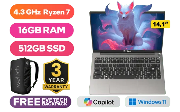 Proline Thinline V14 AMD Ryzen 7 5700U up to 4.3GHz Processor, 12MB Cache, 8x Cores, 16x Threads / 16GB DDR4 RAM / 512GB Ultra-Fast NVMe SSD / 14.1" HD (1366x768) Anti-Glare Display / Integrated AMD Radeon™ Graphics / Windows 11 Home (64bit) / Realtek 8822CE Wireless LAN / Bluetooth 5 / HD Web Camera / 3x USB Type-A / 1x USB Type-C / 1x HDMI / 1x MicroSD Card Reader / 1 x Headphone & Microphone Audio Combo Jack / Standard keyboard / Built-In Speaker / Proline Thinline V14 Ryzen 7 Laptop DealProline Thinline V14 AMD Ryzen 7 5700U up to 4.3GHz Processor, 12MB Cache, 8x Cores, 16x Threads / 16GB DDR4 RAM / 512GB Ultra-Fast NVMe SSD / 14.1" HD (1366x768) Anti-Glare Display / Integrated AMD Radeon™ Graphics / Windows 11 Home (64bit) / Realtek 8822CE Wireless LAN / Bluetooth 5 / HD Web Camera / 3x USB Type-A / 1x USB Type-C / 1x HDMI / 1x MicroSD Card Reader / 1 x Headphone & Microphone Audio Combo Jack / Standard keyboard / Built-In Speaker / Proline Thinline V14 Ryzen 7 Laptop Deal [V146R716512K] / 3 YEARS WARRANTY / [+] GET FREE EVETECH FLUX Premium Gaming Backpack+ FREE DELIVERY !
