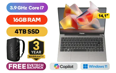 Proline Thinline V14 Intel Core i7-1065G7 up to 3.9GHz Processor, 8MB Cache, 4x Cores, 8x Threads / 16GB DDR4 RAM / 4TB Ultra-Fast NVMe SSD / 14.1" HD 1366 x 768 Display / Integrated Intel Iris Plus Graphics / Windows 11 Home (64bit) / Intel Wireless-AC 9560 Wireless LAN / Bluetooth / 1x SD Card Reader / HD Web Camera / 3x USB Type-A / 1x USB-C / 1x HDMI / 1 x Headphone & Microphone Audio Combo Jack / Standard keyboard / Proline Thinline V14 Core i7 Laptop DealProline Thinline V14 Intel Core i7-1065G7 up to 3.9GHz Processor, 8MB Cache, 4x Cores, 8x Threads / 16GB DDR4 RAM / 4TB Ultra-Fast NVMe SSD / 14.1" HD 1366 x 768 Display / Integrated Intel Iris Plus Graphics / Windows 11 Home (64bit) / Intel Wireless-AC 9560 Wireless LAN / Bluetooth / 1x SD Card Reader / HD Web Camera / 3x USB Type-A / 1x USB-C / 1x HDMI / 1 x Headphone & Microphone Audio Combo Jack / Standard keyboard / Proline Thinline V14 Core i7 Laptop Deal [V146I78256K/16GB/4TB] / 3 YEARS WARRANTY / [+] GET FREE EVETECH NEO Premium Gaming Backpack+ FREE DELIVERY !