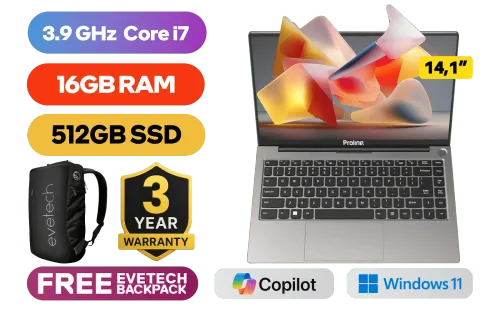 Proline Thinline V14 Intel Core i7-1065G7 up to 3.9GHz Processor, 8MB Cache, 4x Cores, 8x Threads / 16GB DDR4 RAM / 512GB Ultra-Fast NVMe SSD / 14.1" HD 1366 x 768 Display / Integrated Intel Iris Plus Graphics / Windows 11 Home (64bit) / Intel Wireless-AC 9560 Wireless LAN / Bluetooth / 1x SD Card Reader / HD Web Camera / 3x USB Type-A / 1x USB-C / 1x HDMI / 1 x Headphone & Microphone Audio Combo Jack / Standard keyboard / Proline Thinline V14 Core i7 Laptop DealProline Thinline V14 Intel Core i7-1065G7 up to 3.9GHz Processor, 8MB Cache, 4x Cores, 8x Threads / 16GB DDR4 RAM / 512GB Ultra-Fast NVMe SSD / 14.1" HD 1366 x 768 Display / Integrated Intel Iris Plus Graphics / Windows 11 Home (64bit) / Intel Wireless-AC 9560 Wireless LAN / Bluetooth / 1x SD Card Reader / HD Web Camera / 3x USB Type-A / 1x USB-C / 1x HDMI / 1 x Headphone & Microphone Audio Combo Jack / Standard keyboard / Proline Thinline V14 Core i7 Laptop Deal [V146I78256K/16GB/512GB] / 3 YEARS WARRANTY / [+] GET FREE EVETECH NEO Premium Gaming Backpack+ FREE DELIVERY !