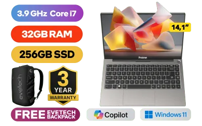 Proline Thinline V14 Intel Core i7-1065G7 up to 3.9GHz Processor, 8MB Cache, 4x Cores, 8x Threads / 32GB DDR4 RAM / 256GB Ultra-Fast NVMe SSD / 14.1" HD 1366 x 768 Display / Integrated Intel Iris Plus Graphics / Windows 11 Home (64bit) / Intel Wireless-AC 9560 Wireless LAN / Bluetooth / 1x SD Card Reader / HD Web Camera / 3x USB Type-A / 1x USB-C / 1x HDMI / 1 x Headphone & Microphone Audio Combo Jack / Standard keyboard / Proline Thinline V14 Core i7 Laptop DealProline Thinline V14 Intel Core i7-1065G7 up to 3.9GHz Processor, 8MB Cache, 4x Cores, 8x Threads / 32GB DDR4 RAM / 256GB Ultra-Fast NVMe SSD / 14.1" HD 1366 x 768 Display / Integrated Intel Iris Plus Graphics / Windows 11 Home (64bit) / Intel Wireless-AC 9560 Wireless LAN / Bluetooth / 1x SD Card Reader / HD Web Camera / 3x USB Type-A / 1x USB-C / 1x HDMI / 1 x Headphone & Microphone Audio Combo Jack / Standard keyboard / Proline Thinline V14 Core i7 Laptop Deal [V146I78256K/32GB] / 3 YEARS WARRANTY / [+] GET FREE EVETECH NEO Premium Gaming Backpack+ FREE DELIVERY !