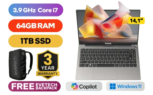 Proline Thinline V14 Intel Core i7-1065G7 up to 3.9GHz Processor, 8MB Cache, 4x Cores, 8x Threads / 64GB DDR4 RAM / 1TB Ultra-Fast NVMe SSD / 14.1" HD 1366 x 768 Display / Integrated Intel Iris Plus Graphics / Windows 11 Home (64bit) / Intel Wireless-AC 9560 Wireless LAN / Bluetooth / 1x SD Card Reader / HD Web Camera / 3x USB Type-A / 1x USB-C / 1x HDMI / 1 x Headphone & Microphone Audio Combo Jack / Standard keyboard / Proline Thinline V14 Core i7 Laptop DealProline Thinline V14 Intel Core i7-1065G7 up to 3.9GHz Processor, 8MB Cache, 4x Cores, 8x Threads / 64GB DDR4 RAM / 1TB Ultra-Fast NVMe SSD / 14.1" HD 1366 x 768 Display / Integrated Intel Iris Plus Graphics / Windows 11 Home (64bit) / Intel Wireless-AC 9560 Wireless LAN / Bluetooth / 1x SD Card Reader / HD Web Camera / 3x USB Type-A / 1x USB-C / 1x HDMI / 1 x Headphone & Microphone Audio Combo Jack / Standard keyboard / Proline Thinline V14 Core i7 Laptop Deal [V146I78256K/64GB/1TB] / 3 YEARS WARRANTY / [+] GET FREE EVETECH NEO Premium Gaming Backpack+ FREE DELIVERY !