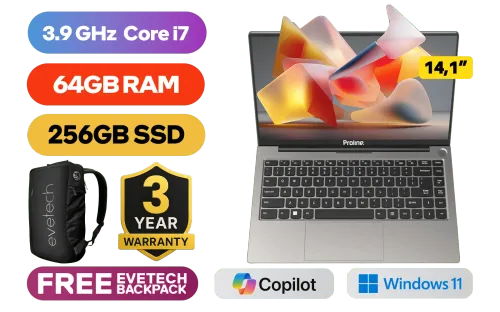 Proline Thinline V14 Intel Core i7-1065G7 up to 3.9GHz Processor, 8MB Cache, 4x Cores, 8x Threads / 64GB DDR4 RAM / 256GB Ultra-Fast NVMe SSD / 14.1" HD 1366 x 768 Display / Integrated Intel Iris Plus Graphics / Windows 11 Home (64bit) / Intel Wireless-AC 9560 Wireless LAN / Bluetooth / 1x SD Card Reader / HD Web Camera / 3x USB Type-A / 1x USB-C / 1x HDMI / 1 x Headphone & Microphone Audio Combo Jack / Standard keyboard / Proline Thinline V14 Core i7 Laptop DealProline Thinline V14 Intel Core i7-1065G7 up to 3.9GHz Processor, 8MB Cache, 4x Cores, 8x Threads / 64GB DDR4 RAM / 256GB Ultra-Fast NVMe SSD / 14.1" HD 1366 x 768 Display / Integrated Intel Iris Plus Graphics / Windows 11 Home (64bit) / Intel Wireless-AC 9560 Wireless LAN / Bluetooth / 1x SD Card Reader / HD Web Camera / 3x USB Type-A / 1x USB-C / 1x HDMI / 1 x Headphone & Microphone Audio Combo Jack / Standard keyboard / Proline Thinline V14 Core i7 Laptop Deal [V146I78256K/64GB] / 3 YEARS WARRANTY / [+] GET FREE EVETECH NEO Premium Gaming Backpack+ FREE DELIVERY !