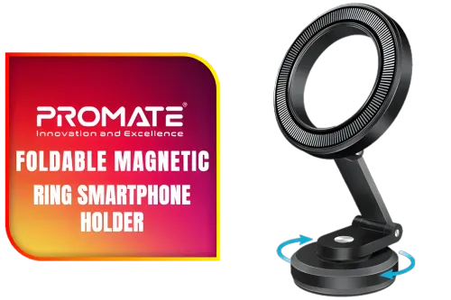 Promate Foldable Magnetic Ring Smartphone Holder / MagGrip™ Compatible / 360° View / Secure Anti-Slip Mount / For Dashboard & Windshield / Foldable Design / Metal Ring Included / MAGHOOP-HG.BLACK / MAGHOOP-HG.BLACK