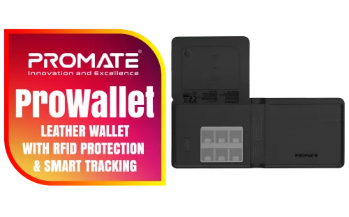 Promate ProWallet - Black / Scratch Resistant Slim Leather / RFID Protection / Works with Apple Find My / Built in Speaker / Supports Wireless Charging / Smart Storage with Extra SIM and MicroSD Slots / ProWallet.Black / ProWallet.Black + FREE DELIVERY !