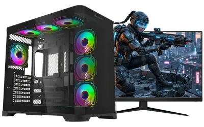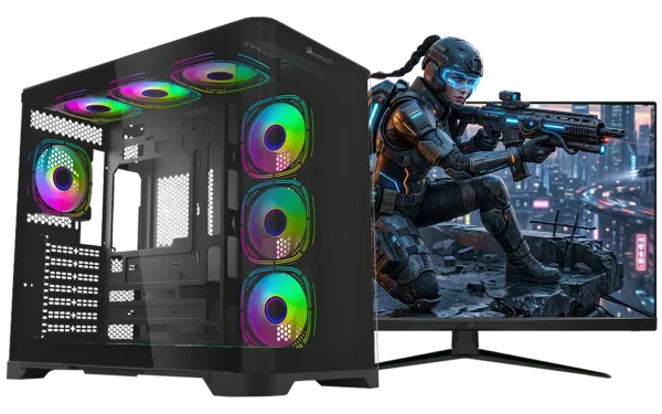 Evetech Aurix Gaming Case with a 270° tempered glass design, 7 pre-installed ARGB fans, ATX/M-ATX support, and a clean dual-chamber layout for strong airflow and a modern look.