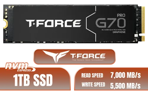 Teamgroup T-Force G70 PRO 1TB NVMe Internal Solid State Drive / Up to 7,000 Read Speed / Up to 5,500 Write Speed / Multiple Caching Systems Available / Patented Graphene Heatsink Technology / TM8FFH001T0C129 / TM8FFH001T0C129 + FREE DELIVERY !