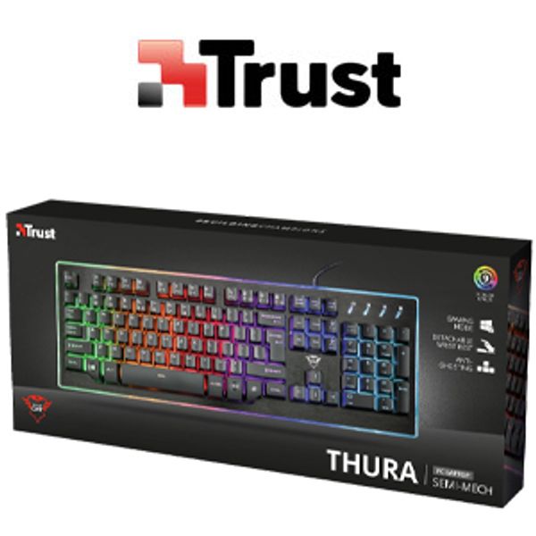 Trust GXT 860 THURA Semi-Mechanical Gaming Keyboard / 9 Rainbow Wave Color Modes / Special Gaming Mode For Disabling The Windows Key / 12 Direct Access Media Keys / Detachable Wrist Rest / Real Metal Crafted Top Plate / Anti-Slip Rubber Feet / TRS-21839