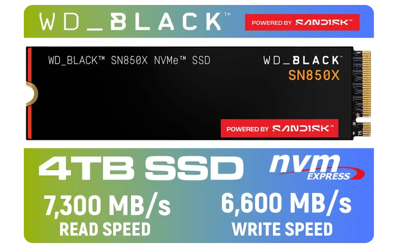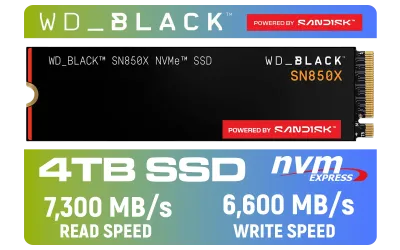 Western Digital SN850X 4TB NVMe Internal Solid State Drive / Up to 7300MB/s Read Speed / Up to 6600MB/s Write Speed / PCIe Gen 4 / WDS400T2X0E