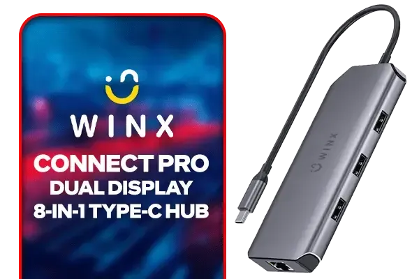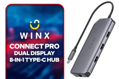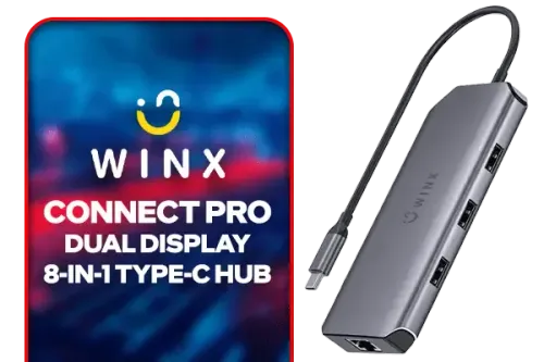 WINX Connect Pro Dual Display 8-In-1 Type-C Hub , Featuring all the essential connections including Gigabit Ethernet, Type-C PD pass through, two 4K HDMI ports plus a DP port, as well as three USB 3.0 ports. / WX-HB101