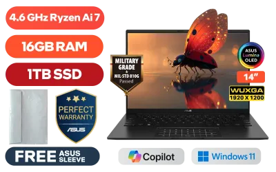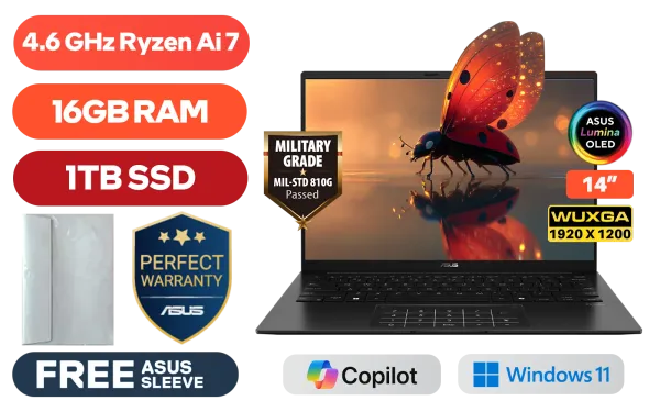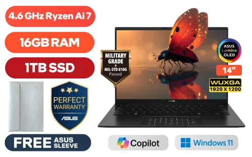 ASUS Zenbook UM3406GA AMD Ryzen™ AI 7 445 up to 4.6GHz, 14MB Cache, 6x Cores, 12x Threads / 16GB LPDDR5X RAM / 1TB Ultra-Fast NVMe SSD / 14" WUXGA (1920 x 1200) OLED Display / Integrated AMD Radeon™ Graphics / Windows 11 Home (64bit) / MediaTek MT7922 Wi-Fi 6E Wireless LAN / Bluetooth® 5.4 / FHD IR Webcam with Privacy Shutter / 1x USB Type-A / 2x USB Type-C (Supports DisplayPort / Power Delivery) / 1x HDMI / 1x Microphone & Headset Combo Jack / Backlit Chiclet Keyboard / Built-in Speakers with Smart Amp Technology / FREE Asus Sleeve / ASUS UM3406GA AMD Ryzen™ AI 7 445 Laptop DealASUS Zenbook UM3406GA AMD Ryzen™ AI 7 445 up to 4.6GHz, 14MB Cache, 6x Cores, 12x Threads / 16GB LPDDR5X RAM / 1TB Ultra-Fast NVMe SSD / 14" WUXGA (1920 x 1200) OLED Display / Integrated AMD Radeon™ Graphics / Windows 11 Home (64bit) / MediaTek MT7922 Wi-Fi 6E Wireless LAN / Bluetooth® 5.4 / FHD IR Webcam with Privacy Shutter / 1x USB Type-A / 2x USB Type-C (Supports DisplayPort / Power Delivery) / 1x HDMI / 1x Microphone & Headset Combo Jack / Backlit Chiclet Keyboard / Built-in Speakers with Smart Amp Technology / FREE Asus Sleeve / ASUS UM3406GA AMD Ryzen™ AI 7 445 Laptop Deal [UM3406GA-O71610B0W] / 3 YEARS WARRANTY + FREE DELIVERY !